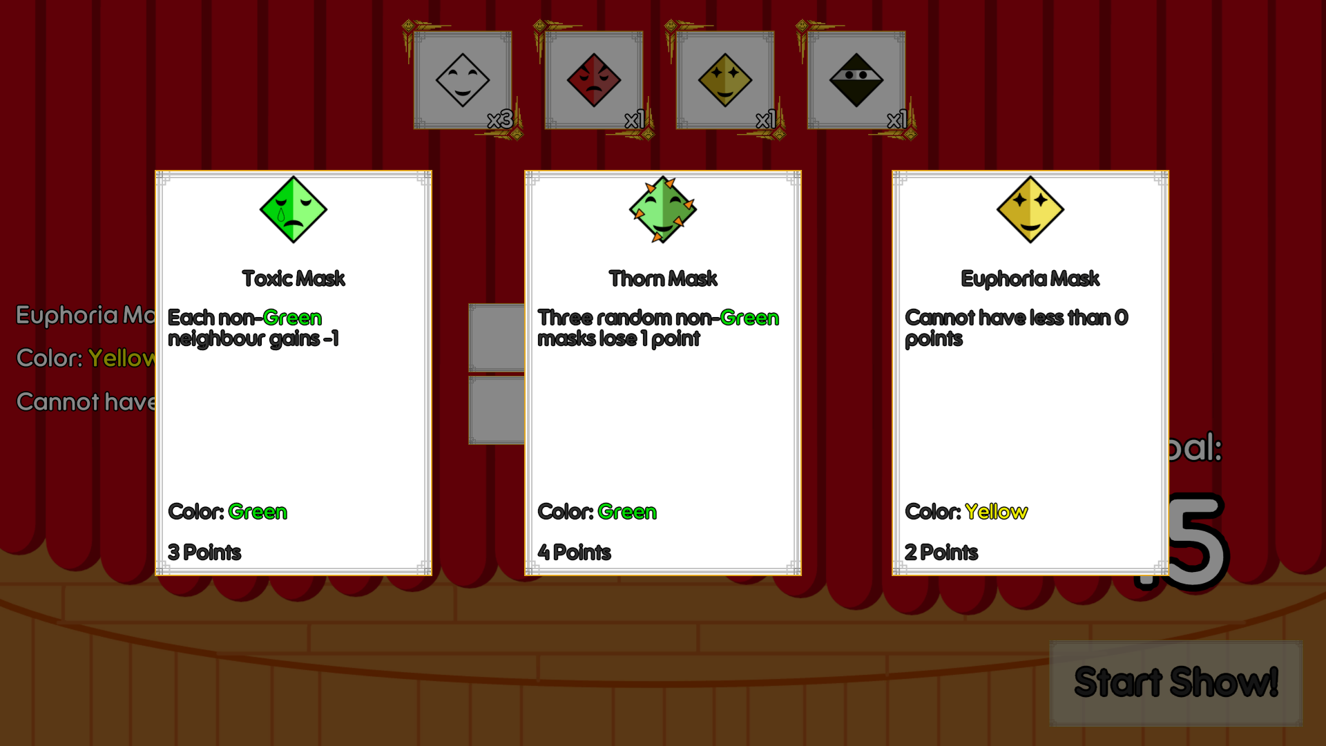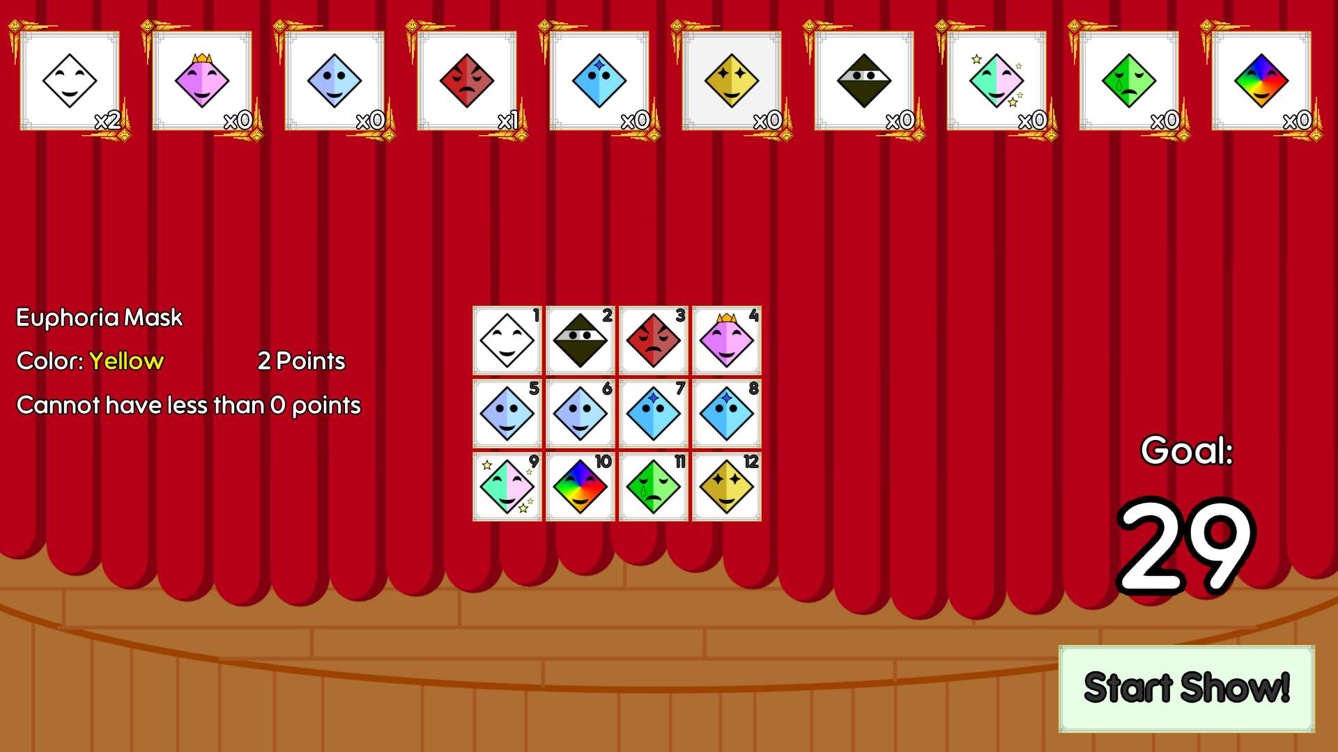 Myriad Theatre is a roguelike/lite where you draft a collection of masks, and build combinations using them to gain enough score to reach the next round.